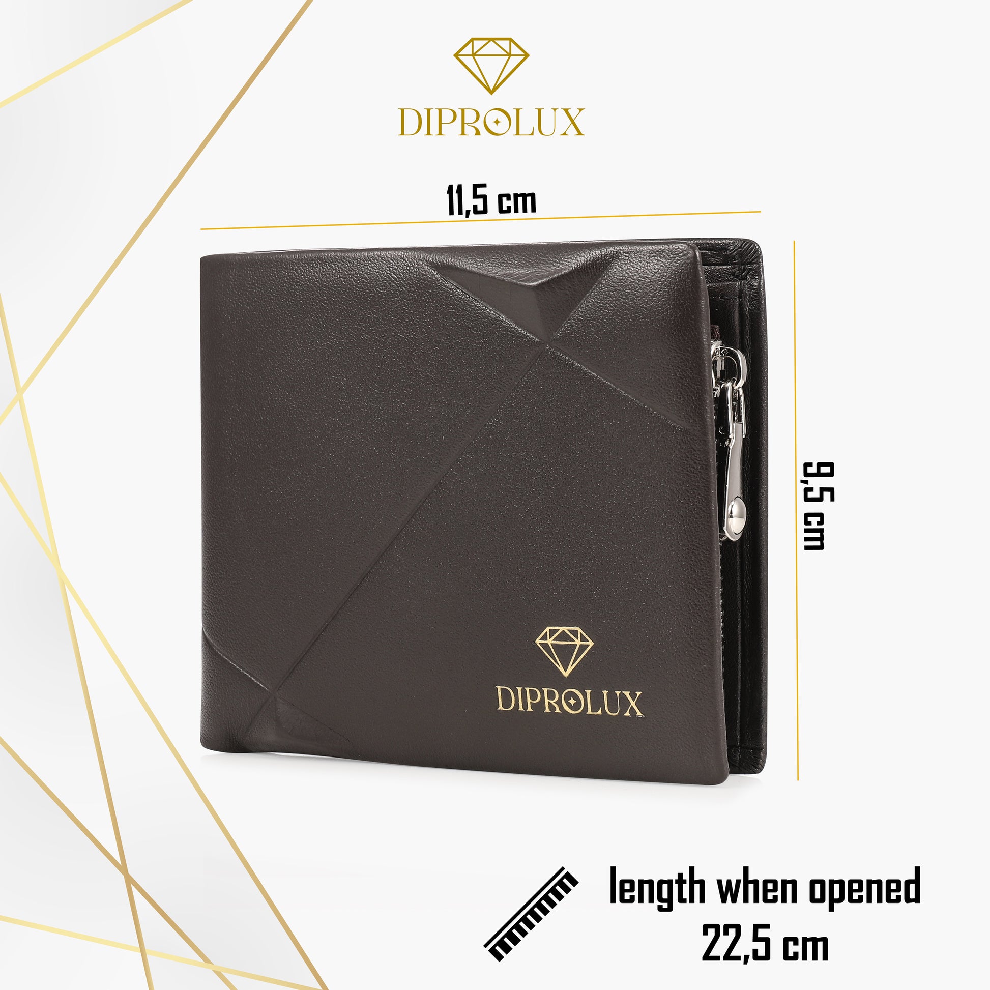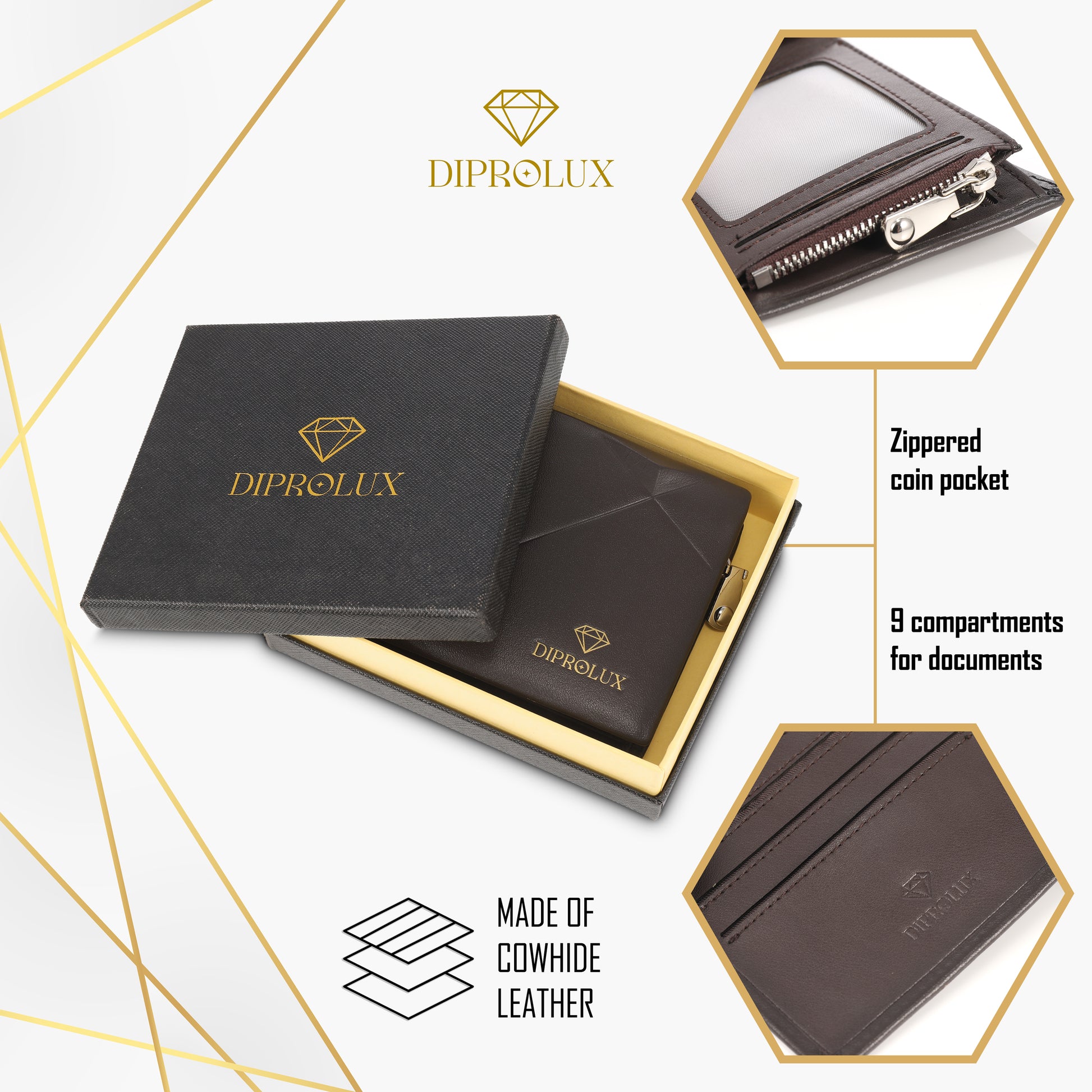 Portemonnaie wird in dekorativer Box geliefert. Die schwarze Verpackungsbox mit dem Schriftzug DIPROLUX und dem goldfarbenen Diamenten- Aufdruck rundet das Bild von einem edlem Produkt vollends gelungen ab